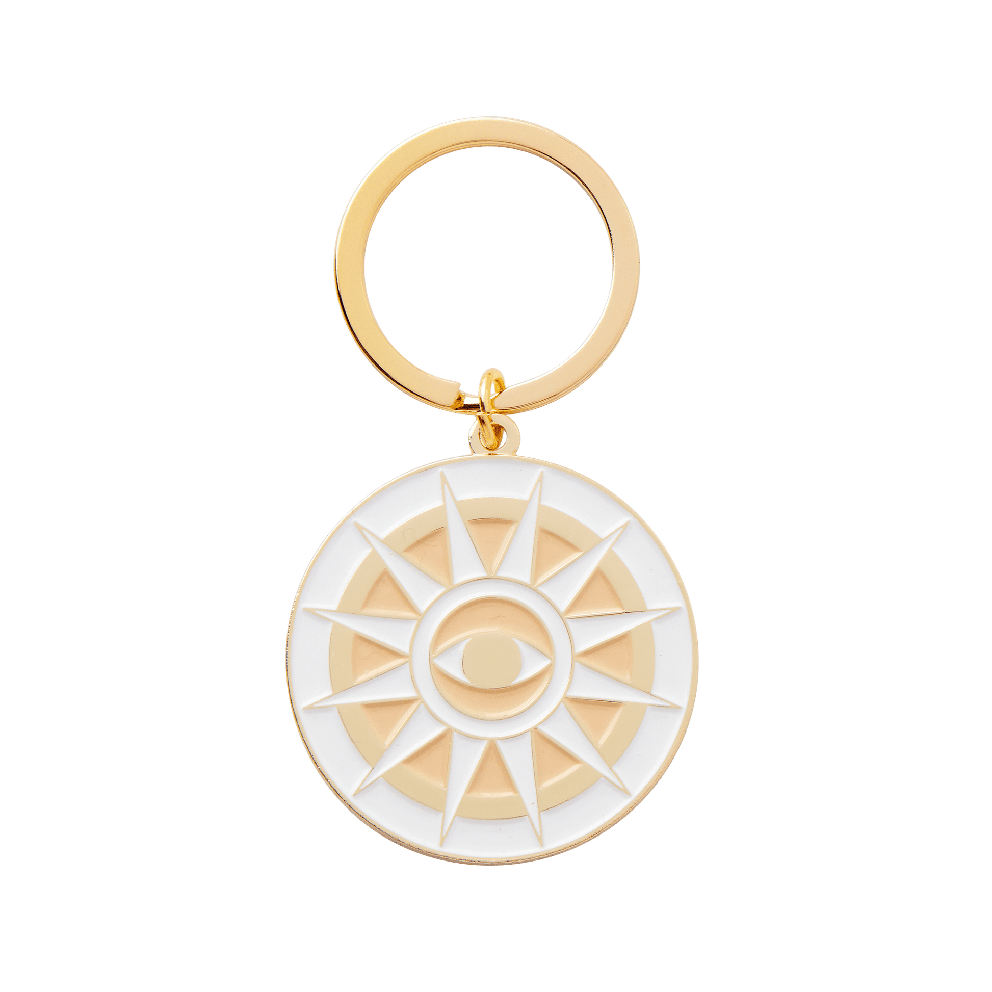Brighten up your day with this white and gold enamel keychain, designed in a circular sun style with a captivating eye at the center. Both stylish and symbolic, it's perfect as a unique gift, a chic bag accessory, or a standout way to keep your keys organised.