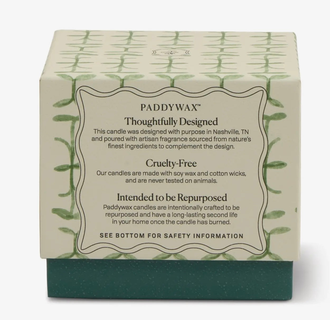 Each glass candle is packaged in a sliding box which features illustrated patterns to coordinate with each bud.